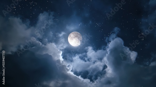 Fototapeta premium Dramatic Full Moon Shines Above Fluffy Clouds in Starry Night Sky View