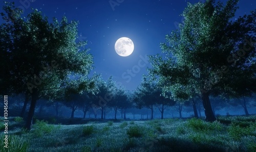Naklejka premium Dramatic glowing moonlight illuminating a peaceful forest scene, with tall...