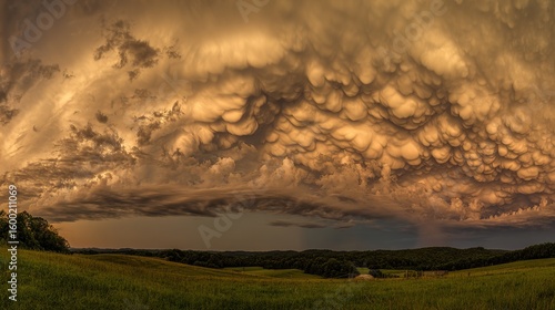 © Shu, Obraz premium Dramatic golden hour sky with vibrant sunset hues blending into dynamic cloud formations, capturing nature's grandeur.