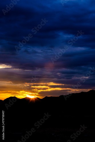 Fototapeta premium Dramatic golden sunset behind mountain silhouettes under deep moody blue clouds