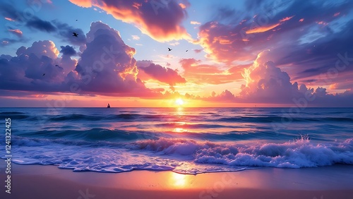 © Din Nasahrudin, Obraz premium Dramatic golden sunset spreading across expansive dune beach with gentle waves and a serene shoreline horizon