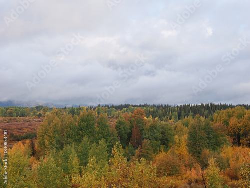 © Alexandre, Fototapeta premium Dramatic Grand Teton mountain peaks framed by low hanging clouds and autumn colors