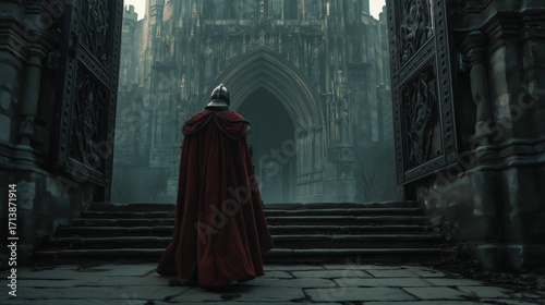 Naklejka premium Dramatic Halloween Artwork of a Headless Knight Standing Before an Eerie Castle Entrance