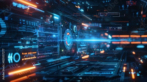 © Ahmad-Muslimin, Fototapeta premium Dramatic High-Tech Interface: Cybersecurity Network with Copy Space