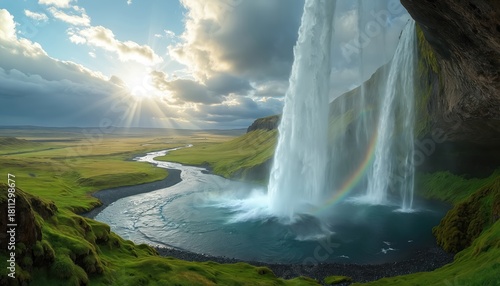 © Vadym, Naklejka premium Dramatic Icelandic waterfall displays brilliant rainbow against cloudy sky. Water cascades down mossy rocks into serene green valley. Sunlight beams through clouds creating magical atmosphere in