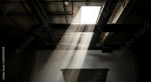 © Tia, Fototapeta premium Dramatic Illumination Inside Industrial Space With Plumbing Against Brick Wall Abstract