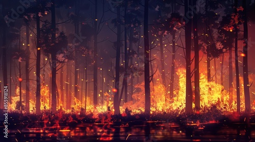 © Bijac, Naklejka premium dramatic illustration of forest fire disaster at night burning trees and damaged environment caused by global warming digital art