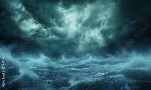 Obraz premium Dramatic image of a stormy sea featuring towering waves and striking lighting conditions.