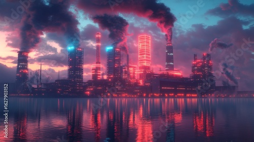 © Zahfran, Obraz premium Dramatic Industrial Cityscape with Reflections on Water and Pollution