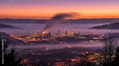 © Kunchan, Fototapeta premium Dramatic industrial landscape with a steaming oil refinery silhouetted against a warm glowing sunrise or sunset sky The urban skyline and factory plant are illuminated by the atmospheric lighting