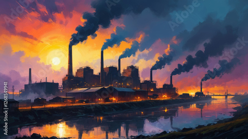 Fototapeta premium Dramatic industrial scene depicting pollution and smoke during sunset, highlighting planet conservation and ecological challenges