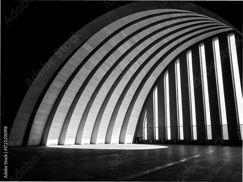 © Basir , Fototapeta premium Dramatic Interior View of Arched Structure with Light Streaming Through Vertical Windows