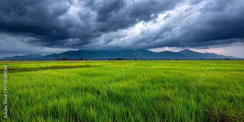 © Narongsak, Obraz premium Dramatic landscape featuring a lush green rice field under an ominous, dark storm cloud formation.