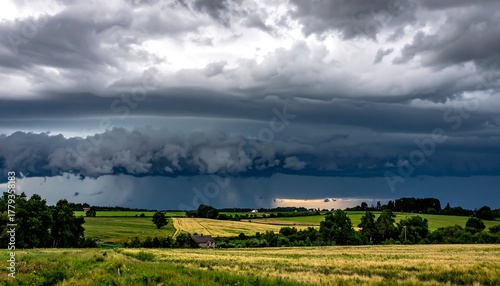 © Junics, Naklejka premium Dramatic landscape of a field with storm clouds overhead