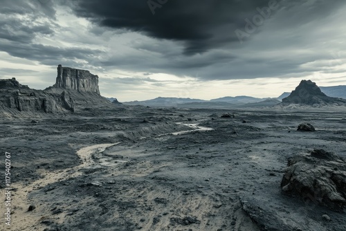 © Pattaragirt, Fototapeta premium Dramatic Landscape of a Stark Desert under Ominous Clouds