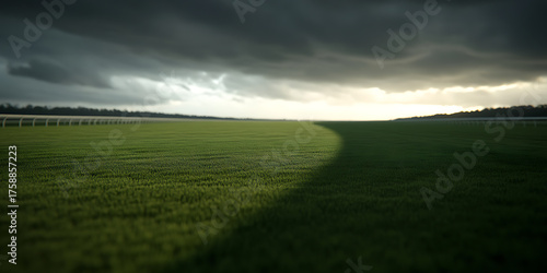 Fototapeta premium Dramatic landscape of a verdant field meeting a stormy sky at twilight, capturing the contrast between light and shadow. The texture of the grass is very detailed.