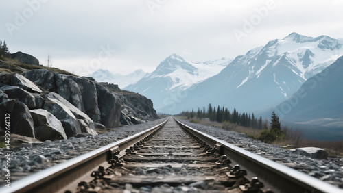 © NIt, Fototapeta premium Dramatic Landscape of Railway Tracks Converging Towards Snow-Capped Mountains under Moody Sky