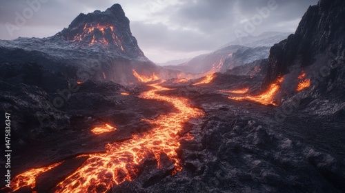 Fototapeta premium Dramatic landscape with flowing lava and mountains