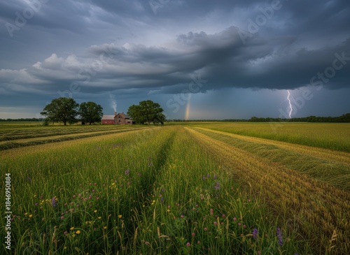 Obraz premium Dramatic Landscape with Lightning and Rainbow Over Golden Fields