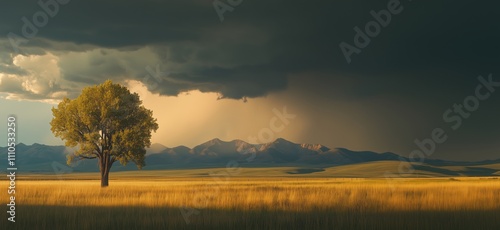 © Vergiliy, Obraz premium Dramatic landscape with solitary tree, golden grass, dark storm clouds, distant mountains, and sunlight, copy space for text