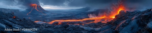 © Alexey, Fototapeta premium Dramatic Lava Eruption Flowing Into a Valley Below. Generative AI