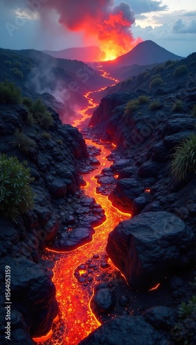© Chaya, Obraz premium Dramatic Lava Flow on Hawaiis Big Island Molten Rock Meets Lush Green Landscape