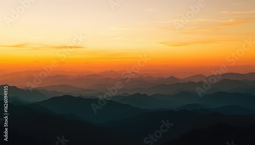 © Patcharin, Fototapeta premium Dramatic layers of shadowy mountains recede into the distance beneath a bright orange and yellow sky at sunset