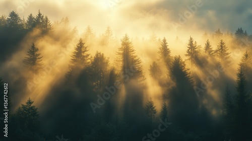 Fototapeta premium Dramatic Light Rays Through Pine Trees in Foggy Forest