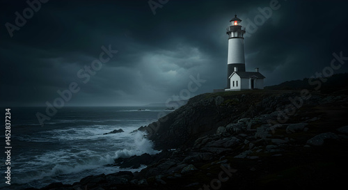 © sarinya, Naklejka premium Dramatic Lighthouse on Rocky Coast Under Stormy Sky at Dusk