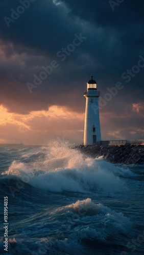 Fototapeta premium Dramatic Lighthouse Sunset with Crashing Waves and Stormy Sky
