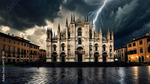© Jason, Fototapeta premium Dramatic Lighting Strikes Over Historic Cathedral in Stormy Night Sky