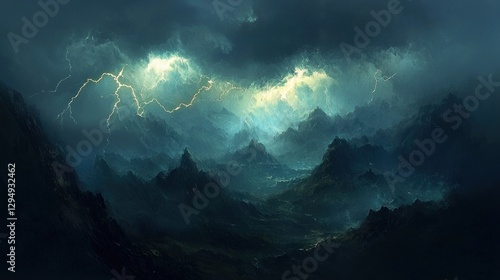 © harryaishi, Obraz premium Dramatic lightning storm over dark mountain range.