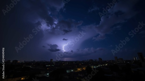 © Kitta Studio, Fototapeta premium Dramatic Lightning Strike Illuminates Dark City Skyline at Night