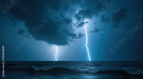 Obraz premium Dramatic lightning strikes over a stormy ocean with dark clouds, symbolizing...
