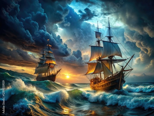 Fototapeta premium Dramatic long-exposure photos capture ancient sail ships battling the sea,...