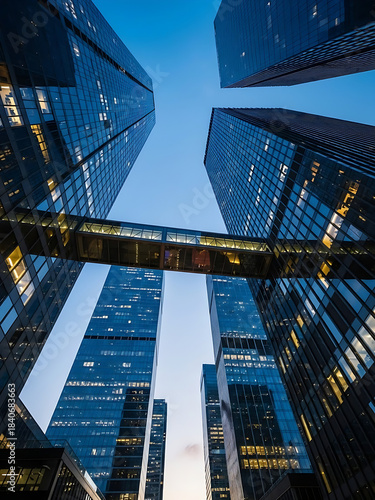 © Stock iT, Fototapeta premium Dramatic low angle view of modern skyscrapers and a railway track converging towards the horizon
