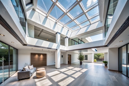 © Caitlin, Fototapeta premium dramatic modern architecture interior rooflines intersecting abstract skylights pouring soft natural light luminous minimalist whitespace calm serene ambiance high contrast monochrome tones