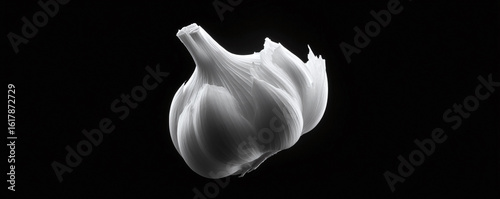© SolaruS, Naklejka premium Dramatic monochrome image of garlic, isolated on black. Conceptual shot for culinary themes, food photography, or healthy lifestyle illustrations. Striking detail.
