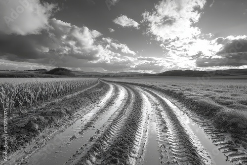 © Borasca, Fototapeta premium Dramatic monochrome landscape with muddy tractor path and stormy sky