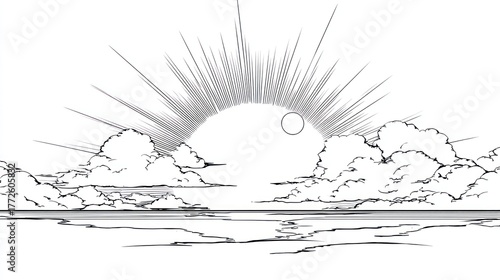 © Mundhut, Fototapeta premium Dramatic monochrome sunrise over water with clouds and radiating light