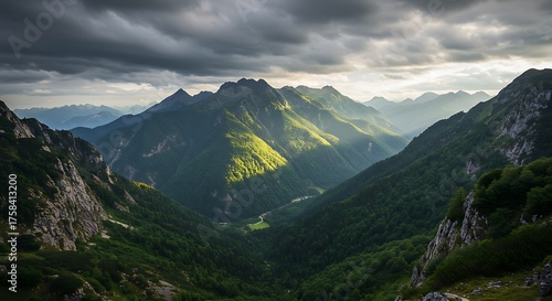 © Naga, Obraz premium Dramatic mountain landscape under a stormy sky with bright sunlight illuminating peaks