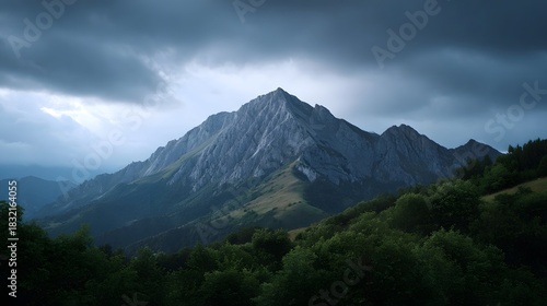 Fototapeta premium Dramatic mountain peak under stormy cloudy skies at dusk with lush green...