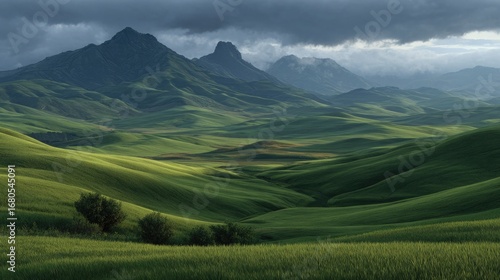 © Razia, Obraz premium Dramatic mountain peaks over green rolling landscape