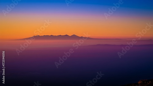 © Mehedi, Fototapeta premium Dramatic mountain range silhouette at sunset with vibrant colors and hazy atmosphere