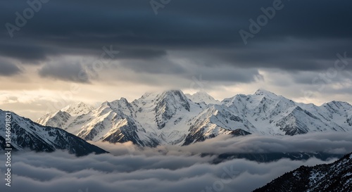 Fototapeta premium Dramatic mountain range sunrise snow capped peaks above clouds. AI Generated