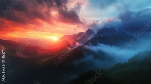 © Pianart, Fototapeta premium Dramatic mountain sunset panorama. Vast, colorful cloudscape over mountain peaks, nestled in misty valleys