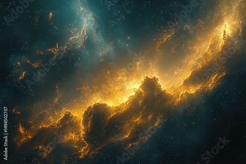 © Abba, Fototapeta premium Dramatic nebula with glowing golden clouds and stardust on dark blue. Perfect for space exploration, sci-fi, or fantasy themed projects.