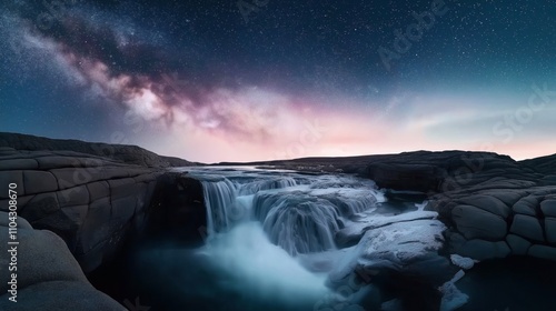 © altitudevisual, Fototapeta premium Dramatic night landscape with waterfall cascading over rocky terrain under a starry sky and glowing Milky Way galaxy.