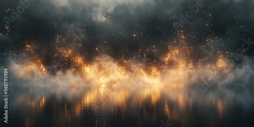 Naklejka premium Dramatic night scene with fiery reflections on calm water