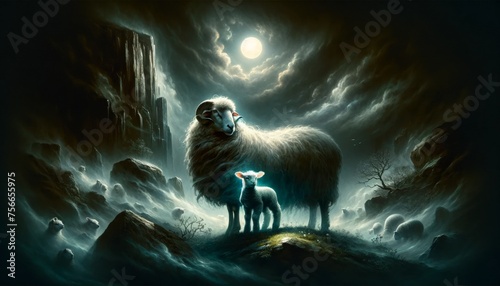 © dragon_fang, Obraz premium Dramatic night scene with sheep and lamb under moonlight
